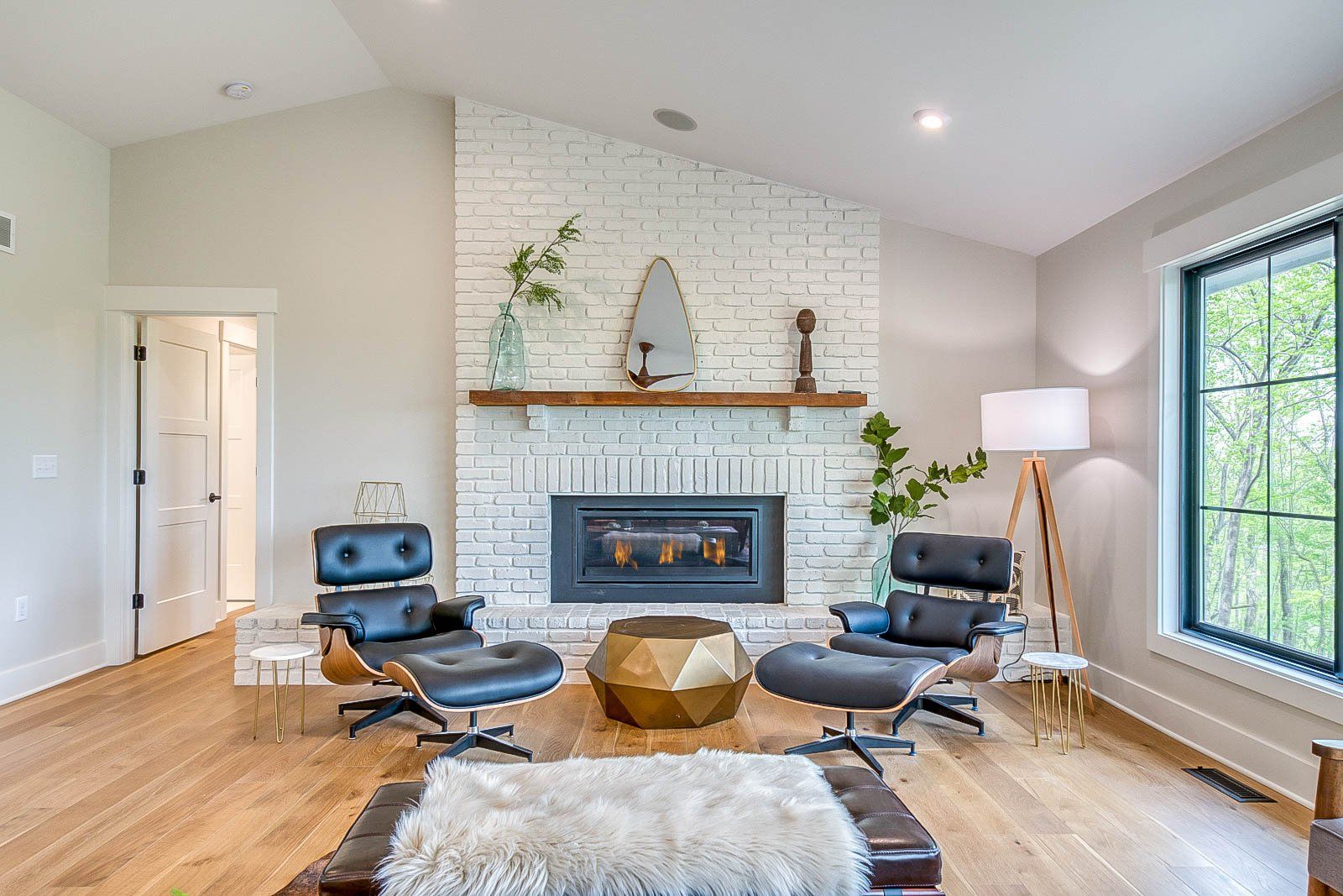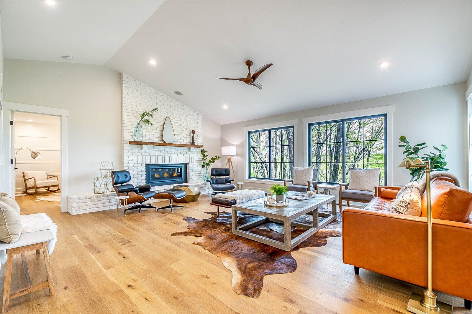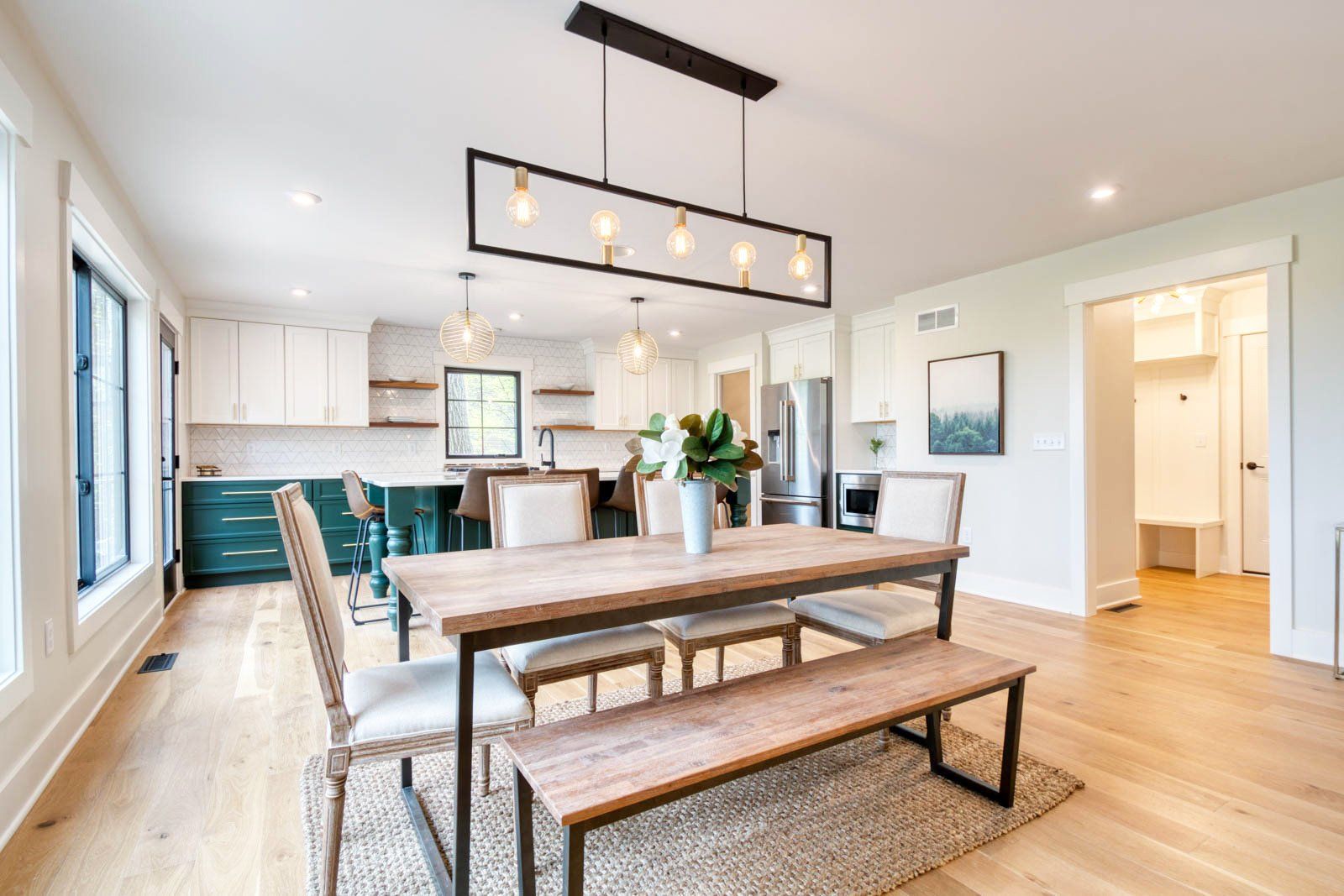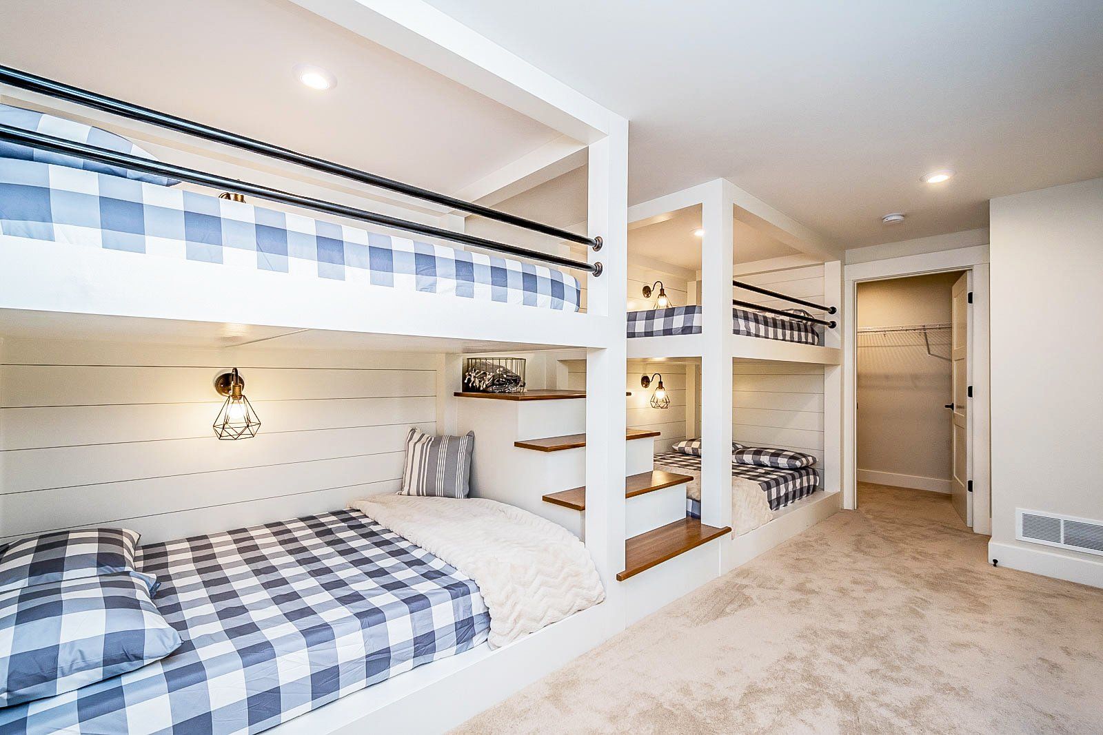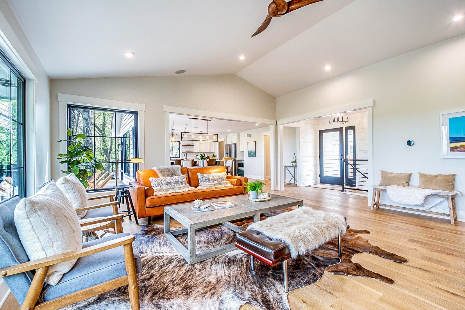 This boho-styled home is a testament to contemporary living, featuring vaulted ceilings that add a sense of openness and airiness. Wide-plank hardwood floors throughout create a warm and inviting atmosphere, complemented by the inclusion of an 8-foot island in the kitchen. Stainless steel appliances, two gas fireplaces, and tall black-grid Anderson-100 windows further elevate the modern aesthetic. The thoughtfully designed mudroom bench enhances practicality and organization, providing a designated space for daily essentials. A unique and charming feature is the built-in four-bunkbed room, adding both character and functionality to the home.