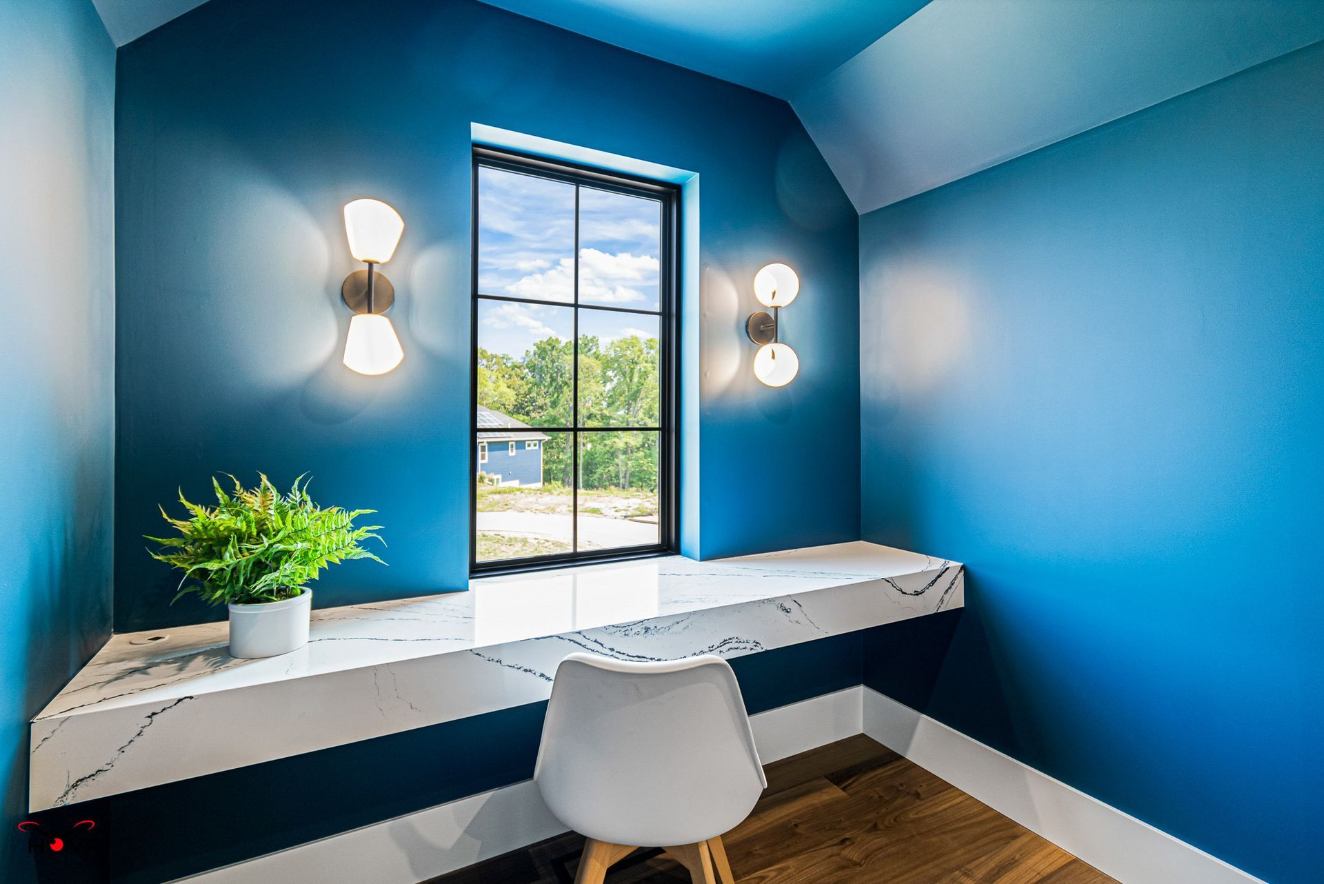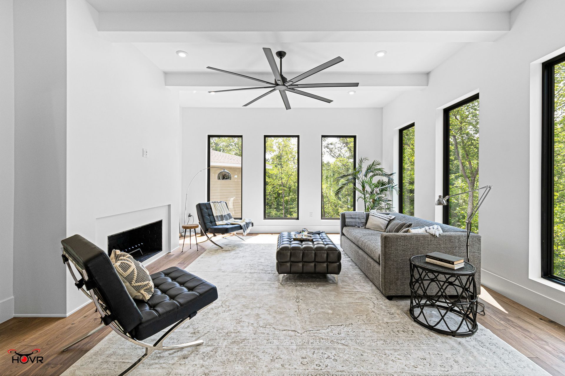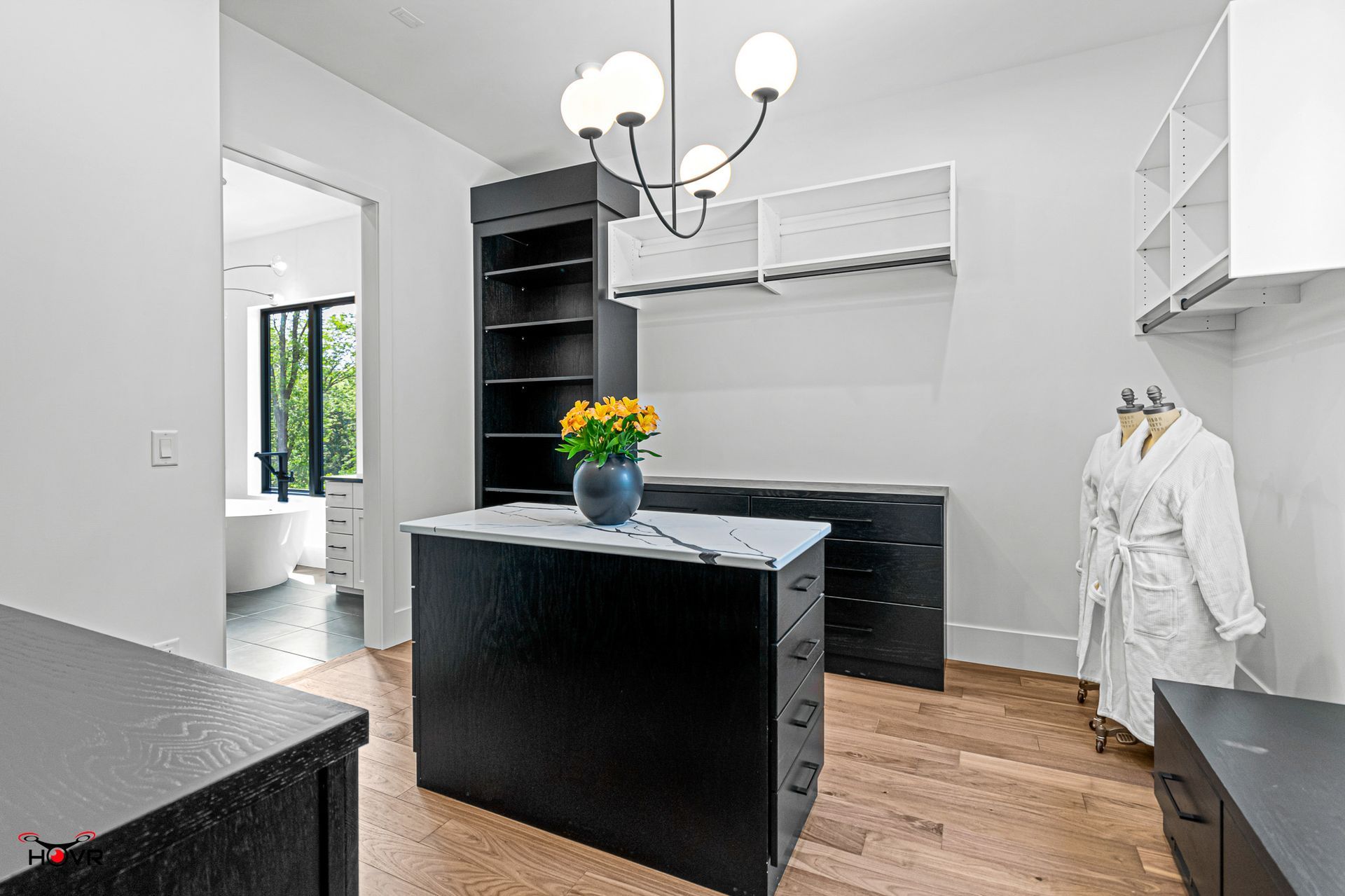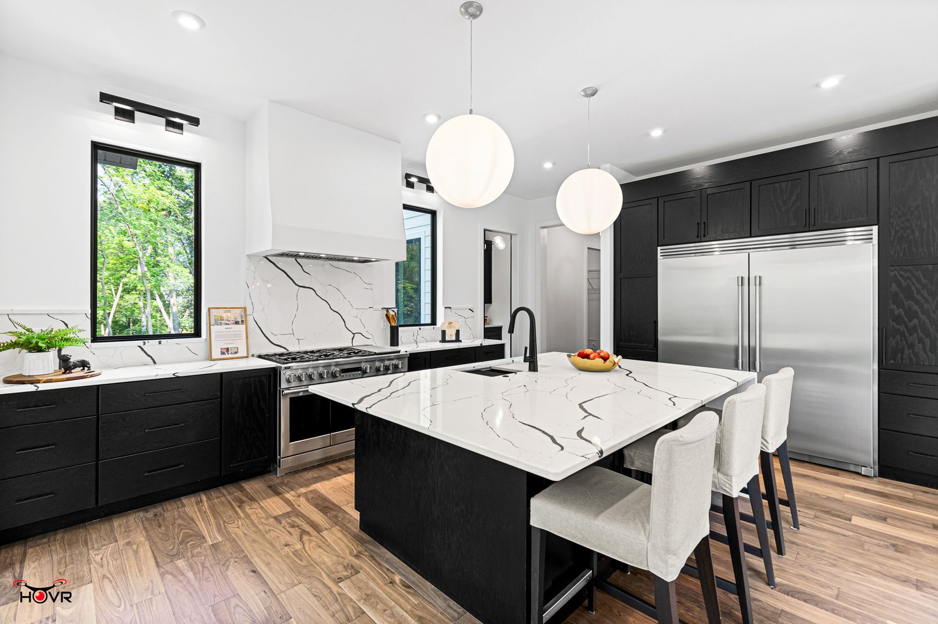 With 10' ceilings gracing the main, second, and lower levels, the home exudes a spacious and airy ambiance. Intricate ceiling details are incorporated throughout, enhancing the overall design. The kitchen, designed for entertaining, includes an oversized eat-in island, perfect for accommodating large gatherings. Outdoor living spaces include a vaulted porch, deck, and a walkout patio, providing residents with versatile options for relaxation and enjoyment. The 2023 Modern Chateau Estate exemplifies a perfect blend of sophistication, whimsy, and modern living, setting a new standard in contemporary home design.